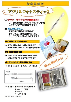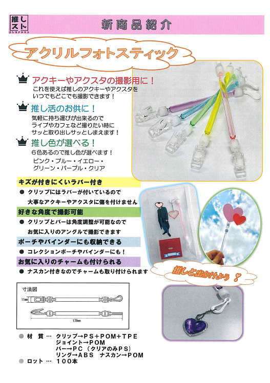 アクリルフォトスティックに新タイプが登場しました!!推し色が選べる6色展開となり、ナスカン付なのでお気に入りのチャームも取り付ける事が可能となりました。従来通り、アクキーやアクスタの撮影用に!これを使え...
